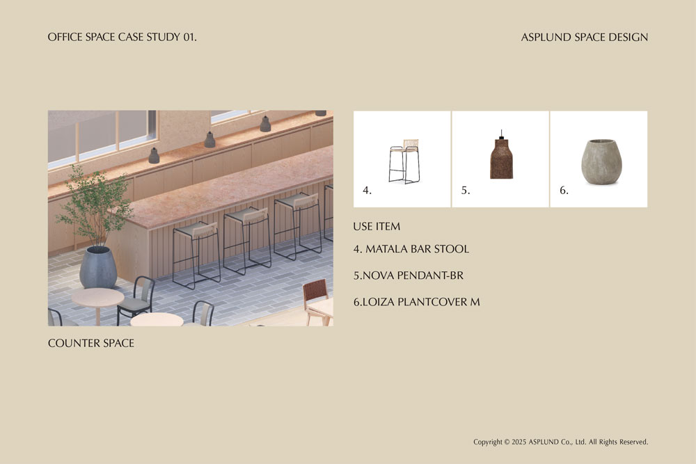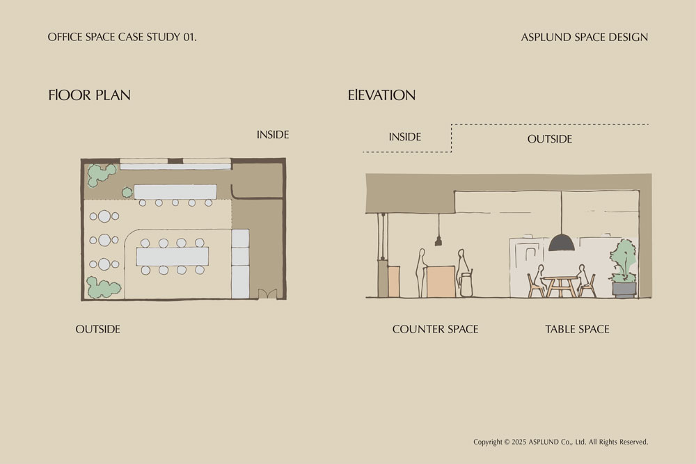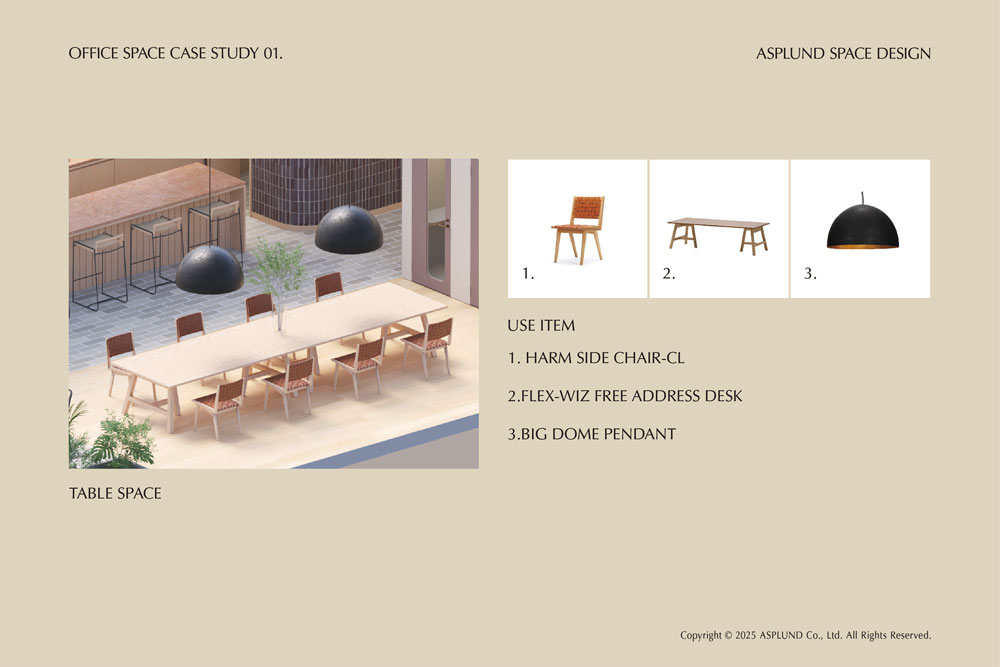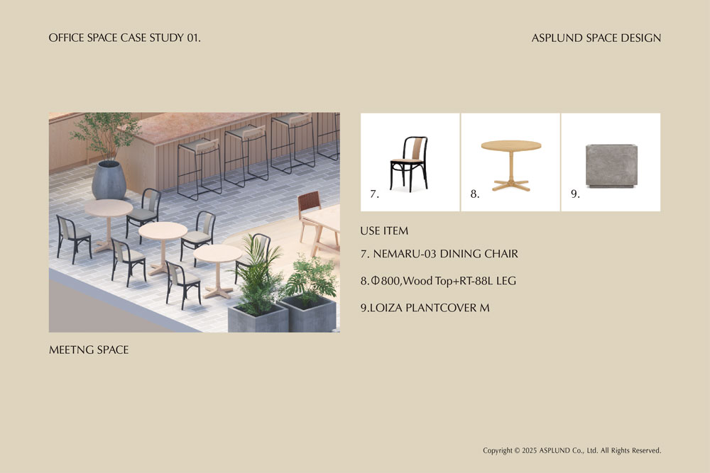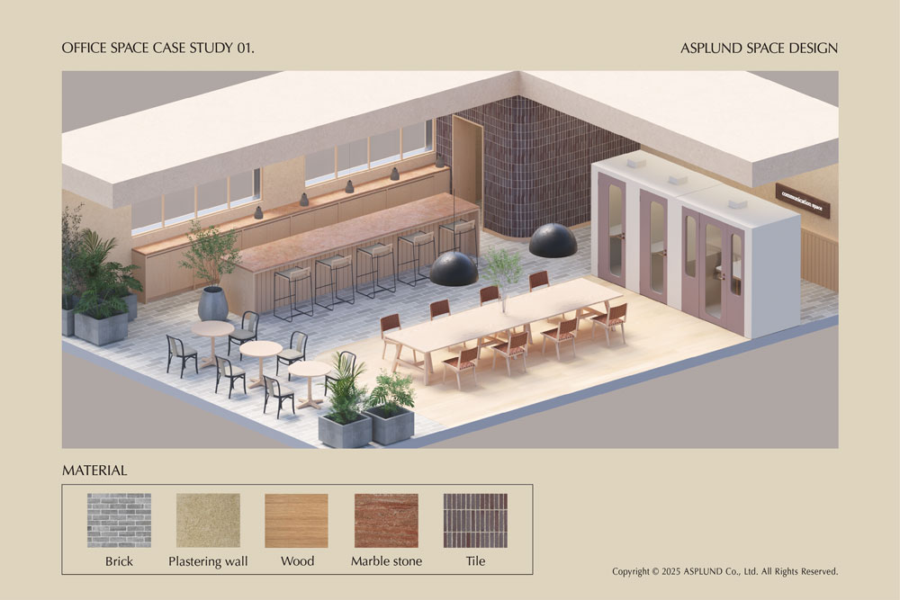 連載企画の第一弾となる今回のコラムでは、”アスプルンドらしいホテルライクなホスピタリティとアウトドア家具を、オフィスデザインに取り入れる”をコンセプトに、架空オフィスの空間設計例をご紹介します。整然で無機質になりがちなワークプレイスに、ホテルのような落ち着きとアウトドアのようなカジュアルさという異なる質感の“対比”を取り入れることで、“余白”と“奥行き”を感じる空間をご提案いたします。