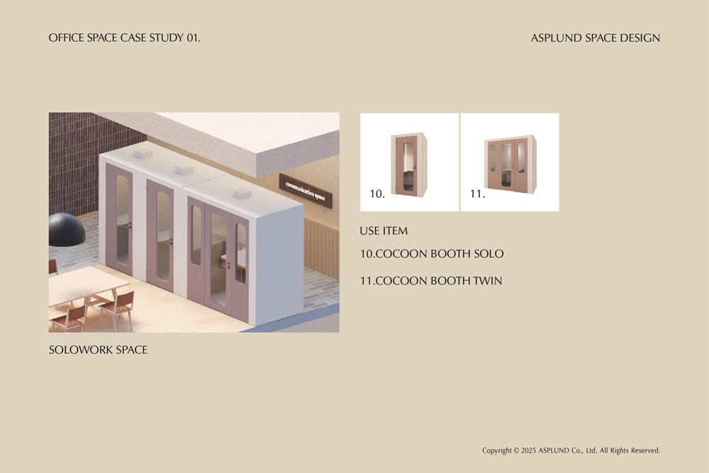 会話やコミュニケーションを重視したオープンなオフィスをつくるには、同時に音を閉じ込められるプライベートな空間も必要です。周囲のノイズを切り離せる個室ブースを設置することで、オンライン会議や1on1、機微なミーティング等に適したプライベートな空間が誕生します。今回はアスプルンドが展開する個室ブース「COCOON BOOTH」から、ナチュラルな雰囲気に溶け込む柔らかなカラーをセレクトし設置しました。